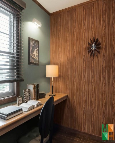 Mẫu giấy dán tường Nhật Bản giả gỗ với gam màu nâu trầm làm tăng thêm vẻ sang trọng cho căn phòng.