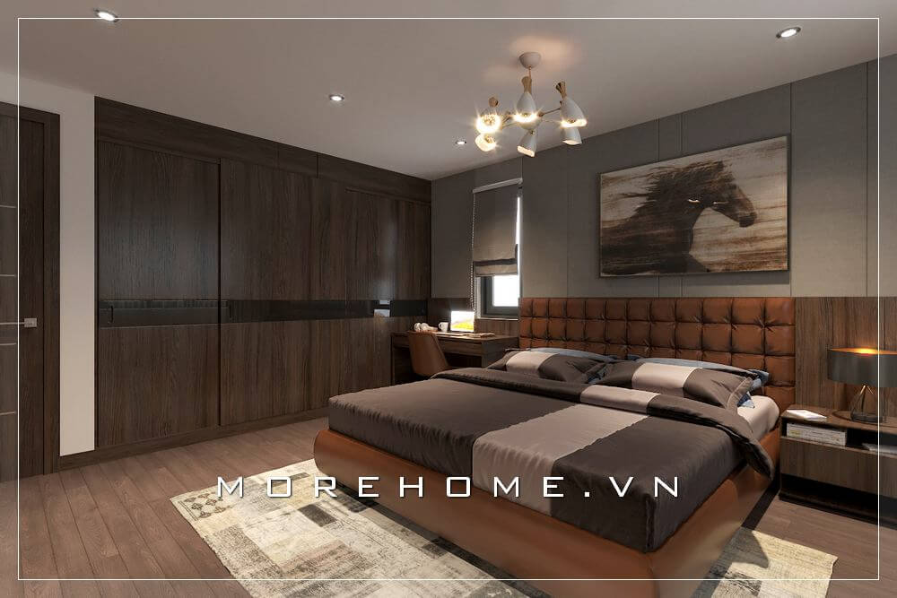 Tone màu nâu trầm được sử dụng xuyên suốt cả khu vực phòng ngủ, chiếc giường gỗ óc chó mang được coi là điểm nhấn ấn tượng cho cả không gian này