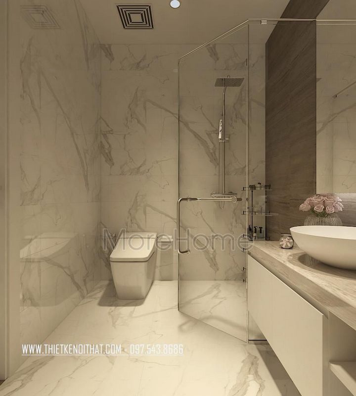 Mẫu thiết kế phòng tắm nhỏ gọn, bao gồm phòng tắm kính cường lực cao cấp và được trang bị đầy đủ nội thất tiện nghi.